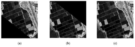 Sensor imaging simulation includes the following aspects: imaging position and attitude simulation, and image space coordinate projection simulation. The base trajectory data was interpolated according to the speed-height ratio of AWSHRHIS, and then, the position in the trajectory is shifted to cover the range of the base DOM. The flight altitude was set to 10,000 m, so the GSD of the image was about 1 m. Image simulation is equal to single-ray backprojection. Since the three-dimensional information of the terrain is lost when it is projected into a two-dimensional image, the fixing elevation coordinate must be provided before we can backproject the ray into the world. For each pixel on the simulated image, according to the position and attitude corresponding to the imaging time, the image ray in the object space system was calculated based on the rigorous imaging model. Then iterative photogrammetry method was used to determine if the ray has intersected the terrain surface. Once the elevation was found, the position can be extracted. According to the object space coordinates , the digital number (DN) value in the DOM was interpolated and assigned to the simulated image. The simulated images were generated by traverse all the image pixels. The parameters of each imager are same with the designed parameters as shown in Table 1.