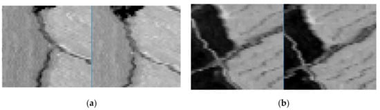 Overlapping area of original images: (a) A same region in the overlapping of left-middle original images; (b) A same region in the overlapping of right-middle images.