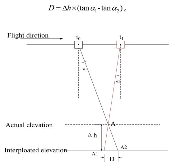 The larger the elevation error is, the greater the influence of the elevation error will be. For the free downloaded global DEM data with elevation accuracy better than 20 m, when the intersection angle in the flight direction of the homonymy points is up to 0.5°, D will reach 0.17 m, which is better than one pixel size for most airborne spectral imagers.