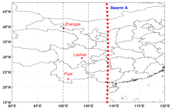 Red dots represent the geographic distribution of the three ionosondes (PUR, LSH, and ZHY considered in this study). Red triangles indicate the moving direction of the Swarm A satellite during the recovery phase of the storm on 9 September 2017.