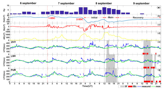 Interplanetary and geomagnetic conditions for the period of 6–9 September 2017: (a) Kp index; (b) Dst index; (c) IMF Bz; (d) AE index. The h’F2 at the ionosondes for 6–9 September 2017 (marked as blue lines): (e) PUR; (f) LSH; (g) ZHY. The average values of the h’F2 (2–6 September 2017) are shown as green lines. The red vertical dashed lines indicate the start time of two sudden storm commencements (SSCs). The black vertical dashed lines indicate the onset time of the second main phase and recovery phase of the storm. The horizontal gray bars and red bars indicate a period when spread F and spread Es occurred, respectively.