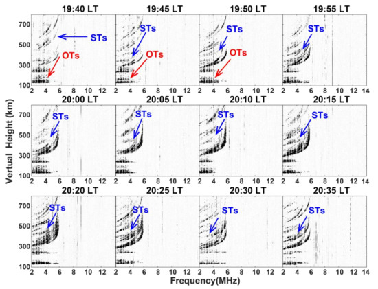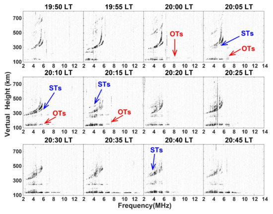 Figure 3, Figure 4 and Figure 5 show the evolution of spread-F on 9 September 2017 at ionosondes of PUR, LSH and ZHY, respectively. The satellite traces (STs) of the F layer are indicated by blue arrows. The oblique traces (OTs) of the Es layer are marked as red arrows.
