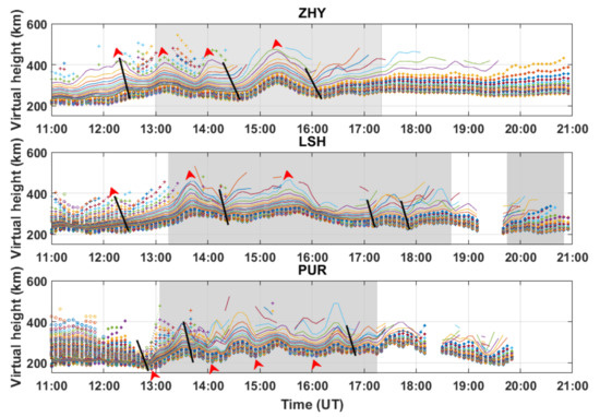 The virtual heights at various frequencies (from 2 to 14 MHz with a step of 0.05 MHz) at ZHY, PUR, and PUR stations during 9 September 2017(11:00–21:00 UT). The black lines indicate the downward movement of the phase velocity of traveling ionospheric disturbances (TIDs) in the ionosphere, and gray bars represent the duration of spread F. The red arrows are used to mark the period of TIDs.