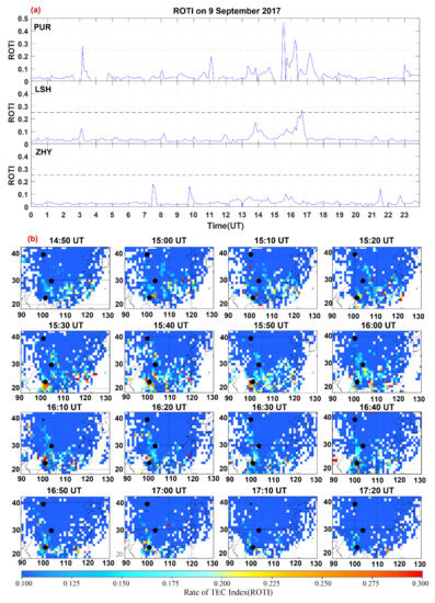 (a) The time variations of three stations’ ROTI on 9 September 2017; (b) two-dimensional ROTI maps of ionospheric irregularities in geographic coordinates over the South East Asia sector from 14:50 UT to 17:20 UT on 9 September 2017. Black stars represent the ionosondes located at PUR, LSH, and ZHY stations, respectively.