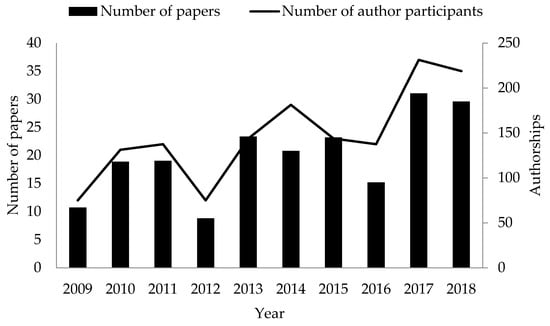 As shown in Figure 1, the number of articles published in 2009–2011 ranged from 12 to 21, but in 2012, the number decreased sharply to 12. In 2013, it displayed a significant rebound to 23, which surpassed the number of publications in 2009–2012. The number of publications increased to 29 in 2014, stabilized at 22–23 in 2015 and 2016 and increased successively in 2017 and 2018. Overall, the number of publications gradually increased from 12 in 2009 to 35 in 2018, assuming a sharp increase. The number of authorships indicates the effort of the involved scientists (Figure 1) and increased from 67 in 2009 to 185 in 2018. The changes over the years were consistent with the trend in the number of articles published, especially the drastic decrease in 2012. In 2016, the number of publications did not decrease significantly, but the number of authors decreased by 41%, from 145 in 2015 to 95.