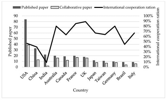 Figure 2 shows the number of publications, the number of international collaborations and the ICRs of the top ten countries. As shown in Figure 2, the number of publications and the ICR were not necessarily correlated. For example, the United States had the most international collaborations, but a lower ICR than those of eight other countries. India ranked number 3 in terms of publication number and was the lowest in terms of ICR; among its 22 publications, only two were from international collaborations. With the exception of Brazil, the countries ranked from 4 to 10 had a higher ICR, indicating that these countries have a high level of international cooperation in this field.