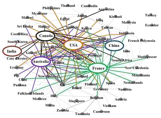 Outside the cooperation network of the top five countries, 18 countries were independent of the cooperation network of the top five countries, i.e., six countries in Asia (Cambodia, Iran, Malaysia, Singapore, Thailand and Vietnam), five countries in Africa (Cameroon, Morocco, Namibia, Tanzania and Zambia), three countries in Europe (Austria, Malta and Turkey), two countries in Oceania (French Polynesia and Kiribati), one country in South America (Ecuador) and one country in Central America (Panama). Of these countries, Cambodia, Tanzania and Zambia have been on the UN’s list of the least developed countries in dire need of technical assistance [], representing challenges in sustainable fishery development.