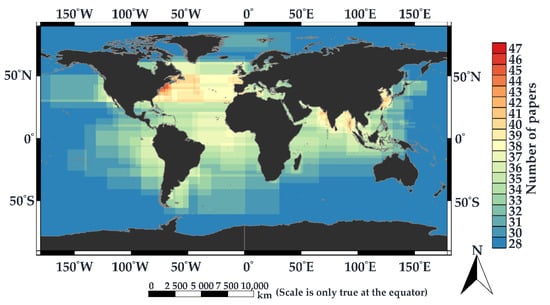 RS data elucidate not only the effects of natural changes but also the impact of human activities on important fisheries [] and further elucidate the feeding behavior and habitat of marine fishery resources [,]. Under sustainable development, groups of scientists have the task of caring for the marine ecosystem []. Quantifying the scientists’ effort is an important task to ensure that it is sufficient and to analyze gaps in global scientific knowledge.