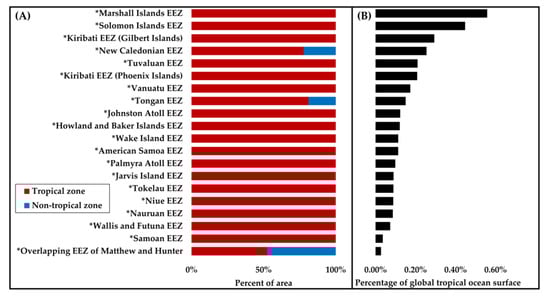 This study analyzed the bottom 20 exclusive economic zones in studies of tropical areas. (A) The percentages of exclusive economic zones in tropical and nontropical areas; (B) the percentages of global tropical ocean surface area represented by exclusive economic zones. (* denotes Pacific island countries.)