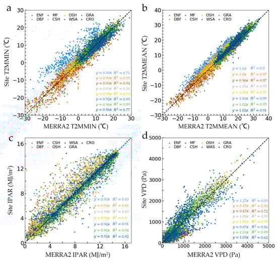 Scatter plots of daily Modern-Era Retrospective analysis for Research and Applications (MERRA2) meteorology reanalysis data against daily site meteorology data: (a) T2M_MIN; (b) T2M_MEAN; (c) IPAR; and (d) VPD from different biome types.