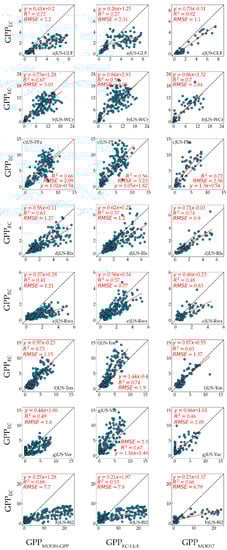 Scatter plots between GPPMODISGPP, GPPEC-LUE, GPPMOD17, and GPPEC for all sites in 2017–2018. The left column refers to the MODIS-GPP model, the middle column represents the EC-LUE model, and the right column represents the MODIS-GPP products.