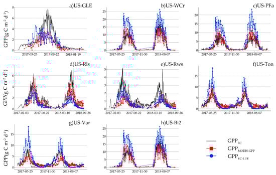Temporal dynamics of GPPMODIS-GPP, GPPEC-LUE, and GPPEC for all sites in 2017–2018. (a): evergreen needleleaf forest site, (b) deciduous broadleaf forest site, (c) mixed forest site, (d) closed shrubland site, (e) open shrubland site, (f) woody savannas site, (g) grassland site, (h) cropland site.