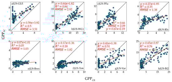 Scatter plots between GPPGR and GPPEC for all sites in 2017–2018. (a–h) represent the site the same as Figure 4.