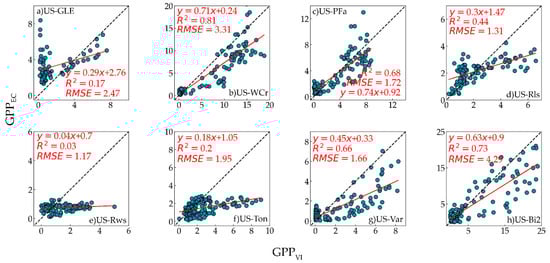 Scatter plots between GPPVI and GPPEC for all sites in 2017–2018. (a–h) represent the site the same as Figure 4.