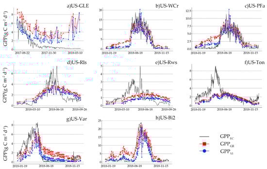 The time series of GPPGR, GPPVI and GPPEC in 2017–2018 are presented in Figure 7. Overall, the temporal dynamics of GPPGR and GPPVI are roughly the same. The GPPGR and GPPVI tracked the GPPEC well at the US-Bi2 site, US-PFa site, US-Var site, and US-WCr site. As shown in Table 6, GPPGR and GPPVI at the US-GLE site were overestimated, with bias = 3.18 gC/m2/d and 1.16 gC/m2/d, respectively. Additionally, GPPGR and GPPVI were underestimated at the US-Ton site, with bias = −0.75 gC/m2/d and −1.48 gC/m2/d, respectively. Notably, both GPPGR and GPPVI showed a poor relationship with GPPEC at the US-Rls site and US-Rws site. This situation was mainly due to the underestimated GPP values during the growing season and overestimating GPP values during the nongrowing season.
