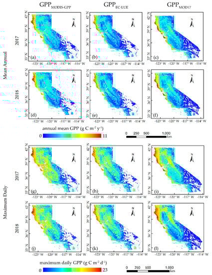 Spatial distribution of the annual mean GPP from the MODIS-GPP algorithm (a,d), EC-LUE model (b,e), and MODIS-GPP products (c,f) in 2017 and 2018 and the maximum daily GPP from the MODIS-GPP algorithm (g,j), EC-LUE model (h,k), and MODIS-GPP products (i,l) in 2017 and 2018.