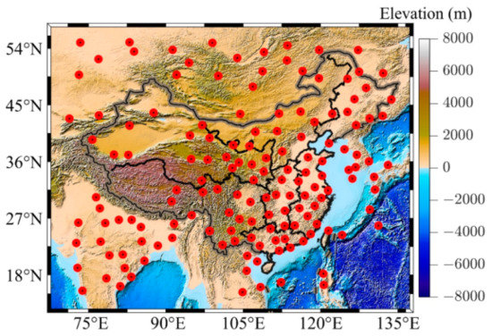 where es denotes the saturated water vapor pressure (hPa), rh is the relative humidity, and Td is the atmospheric temperature (°C). The Tm time series at 00:00 and 12:00 UTC from 2007 to 2016 were computed at each radiosonde station. In total, 150 radiosonde stations were used at last, which are marked out in Figure 1.
