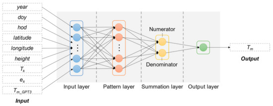 Since Tm has a strong correlation with surface temperature and water vapor pressure [4,22], the radiosonde measured temperature and water vapor pressure at the surface level were used as model input. In addition, empirical models have already well modeled the seasonal variations of Tm, which account for the majority of the temporal variations of Tm and can serve as good prior information for estimating more accurate Tm from machine learning models [18,19]. Therefore, the empirical Tm from the GPT3 model was also taken as one input to the machine learning models. When taking empirical Tm as an input, the high-quality radiosonde Tm is actually used to calibrate and optimize the empirical Tm through the machine learning models. To account for the spatial and temporal variations of Tm, the geographical information (latitude, longitude, height) and temporal information (year, day of year (doy), hour of day (hod)) were also taken as an auxiliary input to the machine learning model. The radiosonde is believed to be the most accurate approach to derive Tm by numerically integrating its vertical profiles of water vapor pressure and temperature [23,24]. The radiosonde-derived Tm were thus treated as target output of machine learning models. Consequently, the relationship between input variables and output Tm through machine learning methods can be written as: