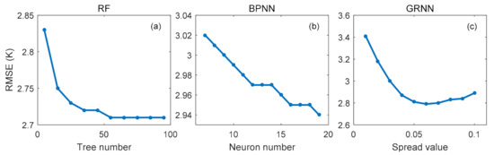 Figure 4a shows that for the RF model when the number of trees increased from 5 to 55, the RMSE decreased. However, the decrease stopped after the number of trees was greater than 55. Therefore, we set the number of trees as 55 for the RF model. Figure 4b shows that for the BPNN model, when the neuron number was in the range from 7 to 19, the RMSE decreased, and the RMSE was the smallest with the neuron number equal to 19. We also tested the case where the neuron number in the hidden layer was larger than 19. We found that when the neuron number was larger than 19, the RMSE still decreased, but the decrease rate was very small, and a very long training time was required. Hence, we set the neuron number in the hidden layer as 19 for the BPNN model. Figure 4c shows that for the GRNN model, the RMSE decreased when the spread value increased from 0.01 to 0.06 and is then followed by an increase when the spread value was larger than 0.06. Therefore, we finally determined the spread value as 0.06 for the GRNN model.