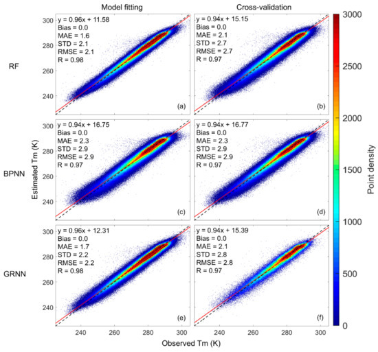 where N indicates the number of samples, are the Tm values output from machine learning models, are the reference Tm values derived from radiosonde measurements, and are the mean values of and , respectively. In the 10-fold cross-validation technique, each sample was tested, and thus it can provide a reliable evaluation of the model accuracy. After performing the cross-validation, we used all the samples for model fitting to yield a final model for later prediction and gave the statistical indicators based on fitting residuals.