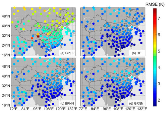 The RMSEs of the machine learning models were apparently smaller than that of the GPT3 model. The averaged RMSEs were 2.6 K, 2.9 K, and 2.7 K for the RF model, the BPNN model, and the GRNN model compared with 4.2 K for the GPT3 model. The number of sites with an RMSE value smaller than 3.0 K was 18 for the GPT3 model (Figure 7a), 90 for the RF model (Figure 7b), 72 for the BPNN model (Figure 7c), and 85 for the GRNN model (Figure 7d). These results demonstrate that the machine learning models have higher accuracy than the GPT3 model and that the RF model performs the best among these machine learning models.