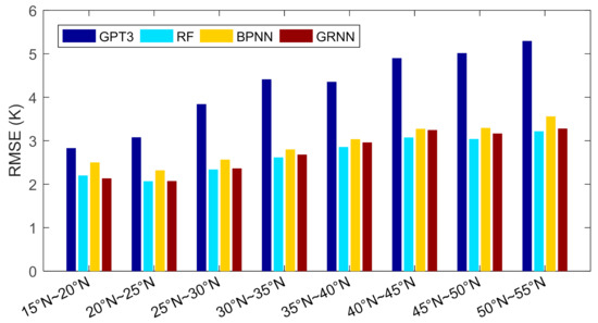 Figure 8 shows that the RMSEs of these models overall increased with increasing latitudes, which is reasonable since the seasonal variations of Tm are stronger in higher latitudes than in lower latitudes. Stronger seasonal variations of Tm bring difficulties in modeling, which leads to larger RMSE in higher latitudes. In all the latitudinal bands, the RMSEs of the machine learning methods were smaller than those of the GPT3 model. Compared with the traditional empirical model GPT3, apparent RMSE reductions were achieved by machine learning methods. This indicates that the machine learning methods significantly improve the accuracy in estimating Tm than the GPT3 model. Comparing these three machine learning models, the RF model performs the best with slightly smaller RMSEs than the other two models, and the BPNN model is worse than the RF and the GRNN models by showing slightly larger RMSEs.