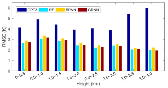 Figure 9 shows that the RMSE of the GPT3 model was overall smaller in lower heights and larger in higher heights. This should be due to the fact that the GPT3 model only estimates the Tm values near the surface and does not calibrate them in the vertical direction; thus, the RMSE of the GPT3 model is large in high heights. The RMSEs of the machine learning models overall decreased with increasing height. This is because, first, the machine learning models have calibrated the empirical Tm values from the GPT3 model in the vertical direction with height information input to the models, and second the magnitudes of Tm are smaller in higher heights. Smaller magnitudes lead to smaller RMSE. Therefore, the RMSEs of the machine learning models are smaller in higher heights.