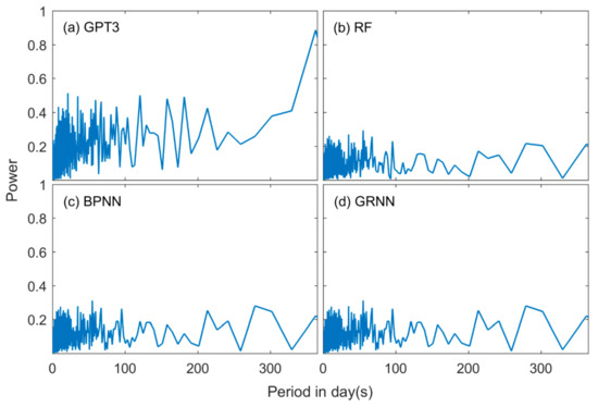 Power spectrums of Tm residuals from (a) GPT3 (global pressure and temperature model 3), (b) RF (random forest), (c) BPNN (backpropagation neural network), and (d) GRNN (generalized regression neural network) models at the station CHM00057083 (34.71°N, 113.65°E).