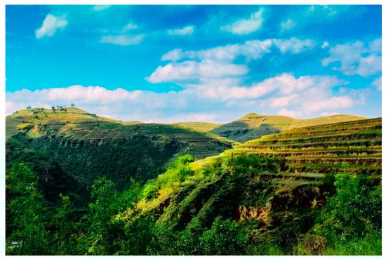 Artificial terraces, as a typical artificial landform, are of great importance to agricultural production and soil and water conservation [1]. The construction of artificial terraces enhances water infiltration, reduces the risk of soil erosion, and improves biodiversity [2,3]. Artificial terraces are widely distributed around the world because of these advantages [4]. Many previous studies reported their effects on soil and water processes [5,6,7]. Nowadays, many artificial terraces are threatened by land degradation and soil erosion because of land abandonment and a lack of maintenance [8]. The Loess Plateau in China, which is a major agricultural production region in China, suffers from severe soil erosion and is a fragmented terrain [9]. Since the 1960s, lots of artificial terraces have been built on the top of the loess hills and hillslopes to improve agricultural productivity. However, the “Grain for Green” project was implemented by the Chinese government in 1999, with the aim to “convert all reclaimed farmland to forestland step by step within a definite time in a planned way” [10]. Through this project, hillsides were closed to actively facilitate afforestation, the ecological environment was improved, and vegetation recovery was accelerated [11]. Currently, the terraces are consistently at risk from gully erosion or gravity erosion because of the lack of maintenance [12,13]. The evident changes in certain artificial terrace areas can be clearly observed (Figure 1). Hence, mapping artificial terraces will help us better understand their spatial distribution and other effects, such as geomorphology, soil erosion, and ecology.