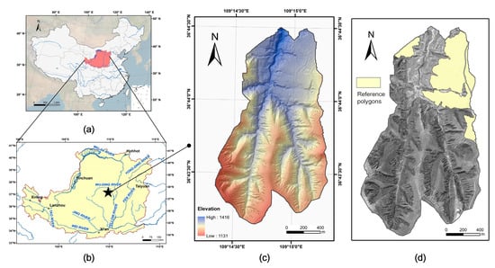 Study area and data. (a,b) show the location of the Loess Plateau, China, and the study area. (c) Digital elevation models (DEMs) of the study area, and (d) WorldView-3 imagery of the study area with ground truth.