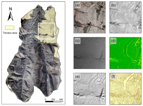 Details of terraces in the study area. (a) Ortho-image of a subset (white polygon) in the study area; (b–f) show the panchromatic band, elevation, slope, shaded relief, and curvature of the subset, respectively.