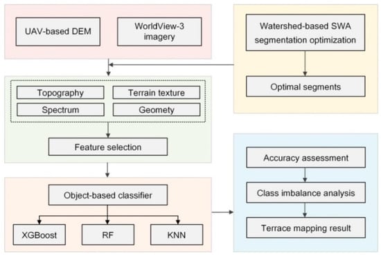 The mapping task began with image segmentation, which is an essential step that affects the accuracy of terrace mapping. In this study, segmentation by weighted aggregation (SWA) was utilized for this step because it can generate multiple level segments without many predefined parameters. Subsequently, a watershed-based optimization strategy was initiated to optimize the segmentation. Then, the spectrum, topography, terrain texture, and geometry were calculated for each suitable segment. Next, a correlation-based feature selection method was adopted to acquire the relevant feature subsets. Subsequently, three object-based ML classifiers, namely, RF, XGBoost, and KNN, were selected for terrace mapping. Finally, the mapping results were validated and compared through an accuracy assessment analysis. Figure 4 illustrates the entire workflow of this study.