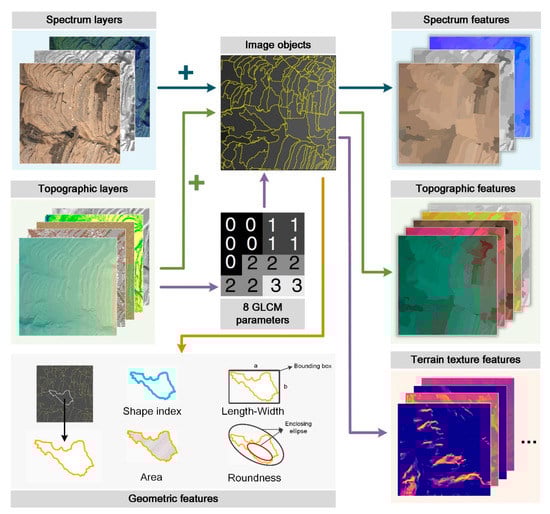 For the ML-based terrace mapping, certain features need to be extracted to train the classifiers. In this study, 55 features were adopted for training the terrace mapping model. An overview of these features is illustrated in Table 1. The detailed descriptions for each feature can be found in Appendix A. Given that the spectrum and geometric features are widely used in the OBIA community [25], this information was used. Five basic topographic factors, namely, elevation, slope, roughness, shaded relief, and curvature, were utilized. Terrain textures, which are beneficial for the extraction of landform entities [45,46], were also adopted. Eight terrain texture measures derived from the gray-level co-occurrence matrix (GLCM) [47] were then calculated on the basis of five topographic features. All these object features were calculated based on the segmentation result using the eCognition software. Figure 5 illustrates the schematic for object-based feature extraction.