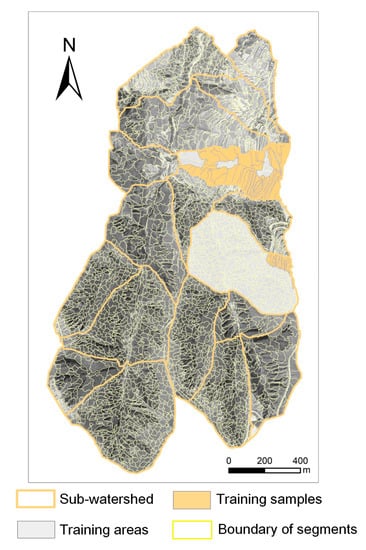 SWA, firstly proposed by Sharon et al. (2000, 2001, 2006) [38,39,40], mainly consists of four steps: (1) constructing the fine-level graph; (2) creating the coarse-level graph; (3) evaluating the saliency of segments; and (4) determining the boundaries of salient segments based on a top-down procedure. In this study, the SWA was used to obtain the multi-level segmentation results based on three visible bands, one near-infrared band, and one panchromatic band. Then, the segments were used as the basic processing units for terrace mapping. Therefore, selecting an appropriate level segmentation from multi-level results is necessary to optimize the segments that are generated by SWA. Present studies have pointed out that the category’s effect on the segmentation selection needs to be considered [30]. This finding indicates that using different levels to segment an image is better than using a universal one [29]. In order to achieve a satisfactory segmentation, it is necessary to consider the homogeneity of segments and significant difference with the adjacent regions [41]. Hence, a watershed-based optimized strategy was used to select the optimal segmentation level on the basis of our previous knowledge [25]. This procedure first chooses the watershed as the basic processing unit because it is usually considered as the fundamental unit of landform [42]. The three following steps are used to extract sub-watersheds: (1) filling the sinks; (2) extracting the stream network; and (3) extracting the watersheds. Eighteen sub-watersheds were extracted; two were used for model training, with the remaining 16 sub-watersheds being utilized for validation. Every sub-watershed has its own segmentation level by considering between-segment heterogeneity and within-segment homogeneity [43]. To meet these requirements, an unsupervised F-measure was utilized [44]. Subsequently, the optimized segmentation level of each sub-watershed was achieved, and the final segmentation result was obtained.