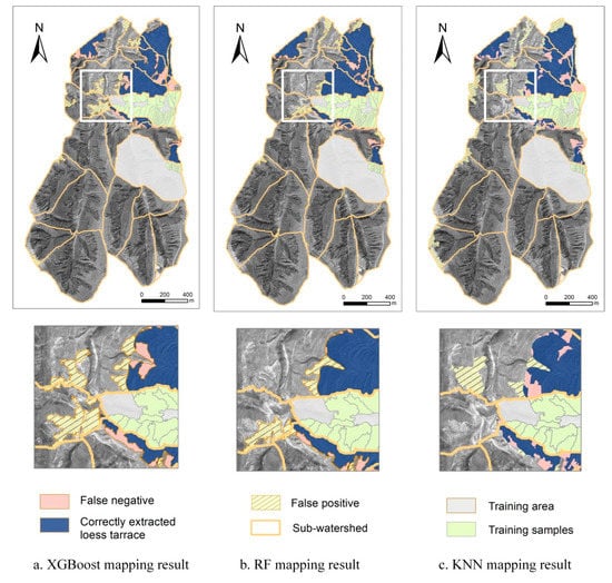 Figure 7 shows the terrace mapping results of XGBoost, RF, and KNN. The results illustrate that terraces and non-terraces were successfully detected. The results indicate that the RF classifier performed excellently by creating an accurate terrace inventory map with only limited incorrectly extracted and unextracted terraces. The visual assessment indicates that for terrace mapping, RF is more reliable than KNN or XGBoost. Most of the incorrectly detected terraces (false positives) in the study area were identified with the KNN classifier rather than RF or XGBoost. Most of the non-detected terraces (false negatives) in the study area were identified with the XGBoost classifier rather than RF or KNN.
