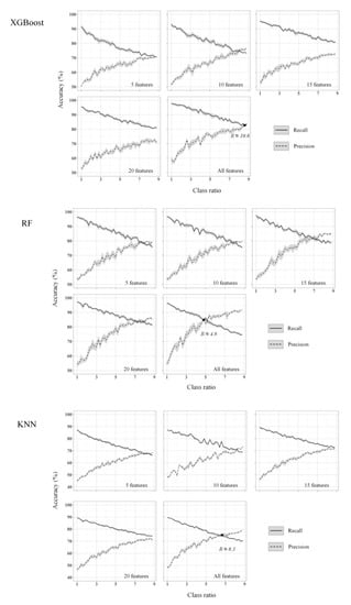 The trends of three ML classifiers in terms of the accuracy value based on different class ratios (R) and feature combinations are similar. As shown in Figure 5, Re is approximately 100% when the value of the class balanced ratio R is set to one. However, the precision is lower than 20%, implying that the extent of terraces are overestimated. As shown in Figure 8, converging curves of the Re and Pr accuracy appear when the value of R changes from one to nine. For the RF, the converging curves can be crossed using five different feature combinations. However, for the XGBoost and KNN, this unique crossing for the converging curves can be achieved only when all the features are used, as shown in Figure 5. The highest balanced Re and Pr for RF that can be achieved was approximately 86% when R ≈ 4.8, which is significantly higher than XGBoost (approximately 81%) and KNN (approximately 75%). RF can obtain 85% Re and Pr when 20 features are applied. This circumstance may imply that training an RF model does not need large datasets.