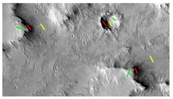 The schematic diagram of the selection of the shadowed and the adjacent sunlit areas (The image is part of the HiRISE image ESP_013855_1650. The red line indicates shadowed areas, the yellow line indicates flat sunlit areas, and the green line indicates the sunlit areas with obvious slope).