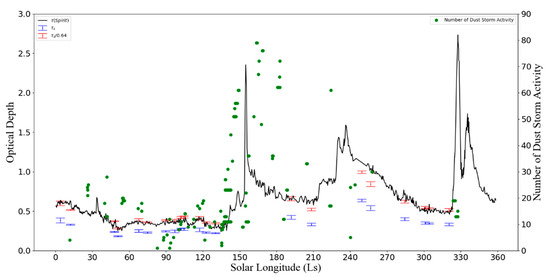 The distribution of optical depth at different solar longitudes in MY29 (the blue error bars represents the optical depth of the inspection area of the Spirit rover calculated by the shadow method, the red error bars represents the optical depth divided by the correction coefficient, the black line represents the optical depth measured by the data of the Spirit rover [16], and green dots represents the number of dust storm activity recorded in the Mars Dust Activity Database (MDAD) at 0°–30°S in MY29 [28]).