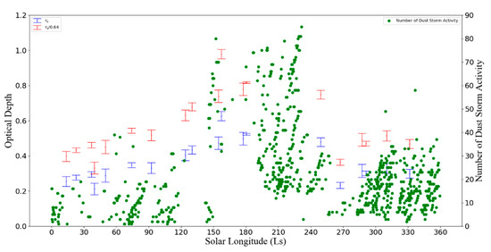 The retrieved optical depth at different solar longitude (the blue error bars represents the optical depth in the candidate landing area calculated by the shadow method, red error bars represent the optical depth divided by the correction coefficient, and green dots represents the number of dust storm activity recorded in the Mars Dust Activity Database (MDAD) at 10°–40°N [28]).
