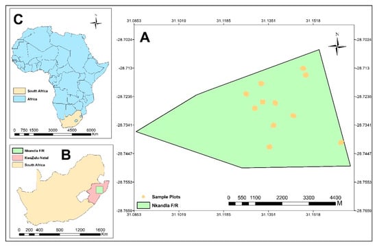 Map of the study area. Note: A is the Nkandla forest reserve, B is the map of South Africa indicating the location of KZN province and the forest and C is the map of Africa indicating the location of South Africa.