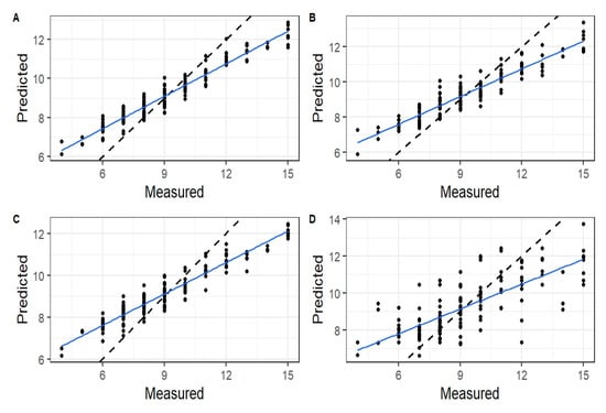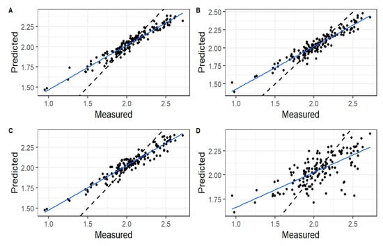 Scatter plot for the Shannon Index prediction. (A) is for Sentinel 2, (B) is for RapidEye, (C) is for PlanetScope, and (D) is for Landsat 8. The blue line is the line of best fit and the dashed line is the 1:1 line as shown on the individual plots.