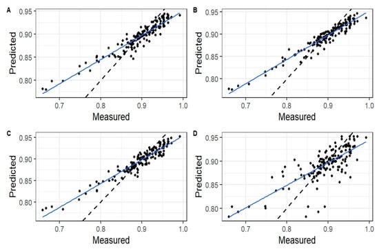 The four RF regression models’ predictive abilities were compared and assessed based on two main statistical parameters. These parameters were the coefficient of determination (R2), and the root mean squared error (RMSE). The means of the 500 bootstrapped samples were used to calculate the accuracy parameters values. The RF regression model with the highest R2 and lowest RMSE values was determined as the most accurate.