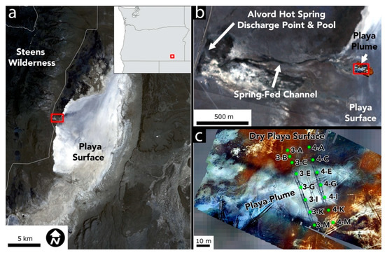 Context map of the Alvord Desert and Alvord Hot Springs (AHS). (a) Regional setting showing the full Alvord Desert playa and context location map in Oregon, USA. Portion of Landsat 8 image LC08_L1TP_043030_20190816_20190902. (b) Overview of the AHS discharge plume. Planet image 20190814_182056. (c) Overview of the AHS plume sampling site. Green points denote ground sampling transect points. Orthoimage produced from drone-derived color imagery.