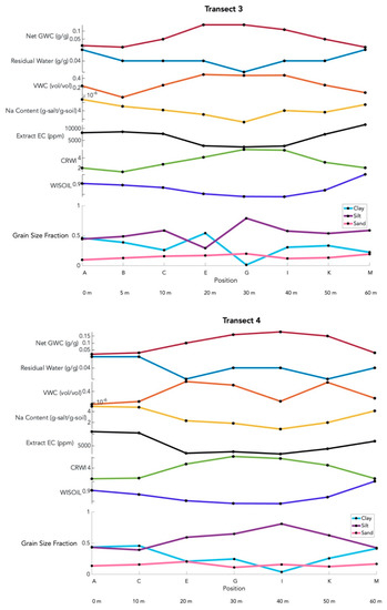 The accumulation of both fines and soil salts at the plume margin suggest that the Alvord Hot Springs plume is a wetland system with unidirectional flow, in which fines and solutes are removed from the water-rich, high-CRWI main flow path to the plume edges, resulting in evapoconcentration of groundwater solutions, e.g., [43], and advection of clay- and silt-sized particles to the margins of the plume through the sandy matrix, producing high-clay, high-salt, low-CRWI edge soils. Unidirectional flow of water in this flat-lying distributary system is further indicated by generally decreasing soil moisture at lower elevations over the 60–70 cm of relief at the site (Figure 15). This stands in contrast to more typical groundwater systems in which soil moisture increases at lower elevations that have greater upslope accumulation area to can capture and route precipitation and which are typically less steep than soils high in drainage basins [44].