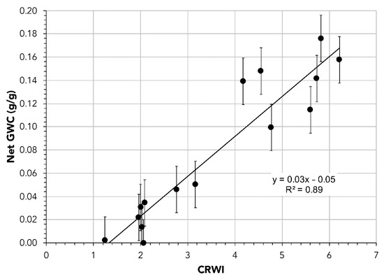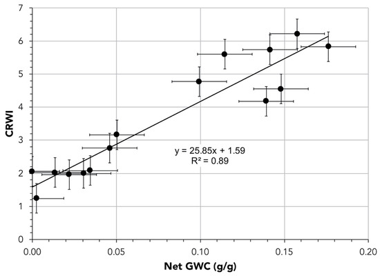 Ground control sampling point water content versus continuum removed water index (CRWI). In this formulation, soil net GWC can be predicted using drone-derived CRWI. Error bars show 95% confidence interval for GWC determined via CRWI analysis.