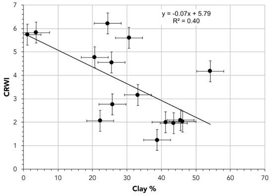 Relationship between continuum removed water index (CRWI) and ground control sample clay content. p = 0.01.