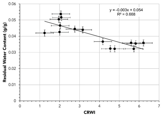 Continuum removed water index (CRWI) versus residual water content. Samples that have enhanced residual water content after air drying showed lower CRWI in the field. p < 0.001