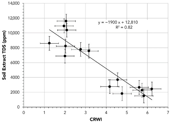 CRWI is also inversely related to potential residual water content measured in the soils (Figure 8). Soils that would retain intergranular water during air drying have lower CRWI values measured in the field than soils that air dry to nearly zero net soil moisture. CRWI is anti-correlated with soil extract total dissolved solids—saltier soils have lower CRWI values (Figure 9). Likewise, soil moisture content in the plume is inversely correlated with total salinity. Drier, plume-margin soils show higher soluble salt concentrations than plume-interior sampling points that were wetter at the time of sampling.