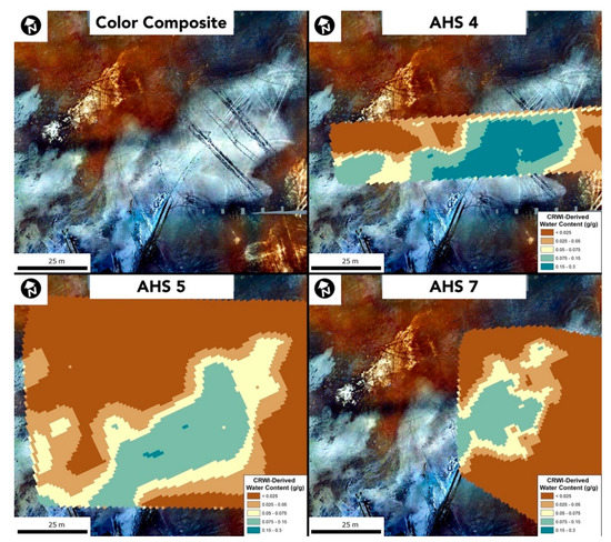 CRWI-derived soil moisture for each of the three completed overflights. Color composite panel shows just the color ortho-image of the Alvord hot spring plume. Panels AHS 4, 5, and 7 show gridded data for three drone sorties.