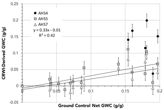 Ground control point net gravimetric water content (GWC) versus CRWI-derived GWC at the ground sampling points. Linear fit show is for AHS 7, R2 = 0.42, p = 0.017.